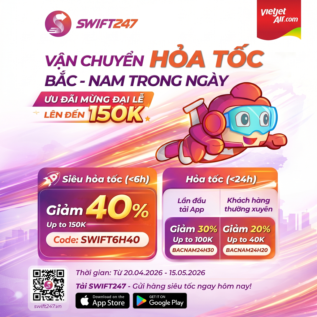 May là em được đứa bạn mách dùng thử dịch vụ giao hàng Swift247, vận chuyển xuyên Việt siêu tốc từ Hà Nội - Đà Nẵng - Sài Gòn trong ngày, không tăng giá, lại còn ƯU ĐÃI hoạt động xuyên suốt trong cả mùa Tết.